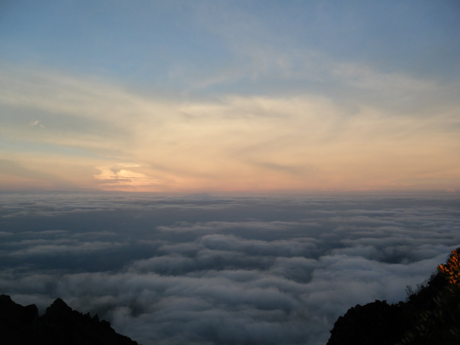 By around quarter to six, strips of orange and green began to break along the horizon line and we sat there, above the clouds, waiting. On a clear day, you can see both the Pacific and Caribbean oceans from the summit. Our day was a little cloudy, but the view was still completely magnificent in its own way as the sun came up, casting colors into the fog, clouds and sky that we felt a part of. We stood at 11,398 feet looking down at clouds below, at the hills and the swirls of white, orange, pink and blue that surrounded us. Fatigue in our legs was forgotten, the hike down wasn't a concern because the breathtaking view trumped everything. The pictures below can't quite capture the natural beauty.